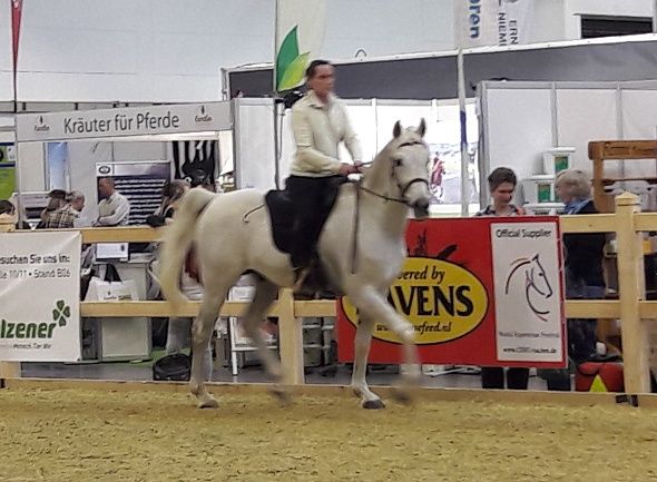Auf der diesjährigen Equitana war der Hengst Serenity Shaham (AK Shah Munifeh - Hamamii), Besitzerin Silvia Naumann, der einzige Vertreter der Vollblutaraber. Obwohl durch eine Vollbremsung bei der Anreise, bei der er Blockaden davon getragen hatte, gehandicapt, trug der gekörte und leistungsgeprüfte Distanzsportler (VZAP Sportpferdeplakette 2015 u. 2016 in Gold) seine Besitzerin trotz Messetrubel zuverlässig und gelassen ohne Sattel im Ring und zeigte sich sehr kinderlieb. Auf dem Foto stellt ihn Frau Dr. Gesellensetter als Fremdreiterin vor. Shaham (Z.: Hansi Heck-Melnyk, USA) bewies den leistungsbereiten und sanftmütigen Charakter des Asil Arabers und erhielt dafür viel Applaus.