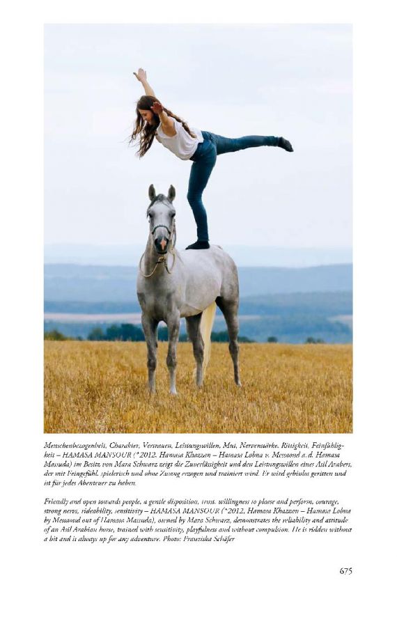 Menschenbezogenheit, Charakter, Vertrauen, Leistungswillen, Mut, Nervenstärke, Rittigkeit, Feinfühligkeit – HAMASA MANSOUR (* 2012, Hamasa Khazzan – Hamasa Lobna v. Messaoud a. d. Hamasa Massuda) im Besitz von Mara Schwarz zeigt die Zuverlässigkeit und den Leistungswillen eines Asil Arabers, der mit Feingefühl, spielerisch und ohne Zwang erzogen und trainiert wird. Er wird gebisslos geritten und ist für jedes Abenteuer zu haben.