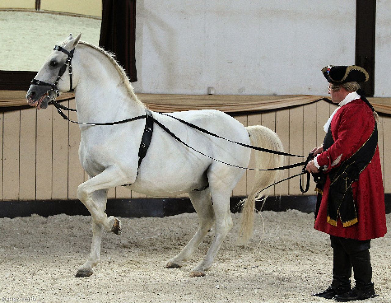 Wir trafen uns um 13:30 Uhr zu einem Empfang vor der Reithalle, um danach die Vorführungen der Fürstlichen Hofreitschule zu bewundern. Frau Christine Krischke begleitete die Vorführungen der verschiedenen Rassen mit ausführlichen Erklärungen, unter anderem zur Geschichte der klassischen Reitkunst.